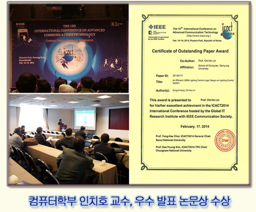 세명대학교 컴퓨터학부 인치호 교수(CAD & Soc Design Lab.)는 2014년 2월 16일(일)부터 19일 (수)까지 Global IT Research Institute에서 주관하며 평창 휘닉스파크에서 개최된 The 16th International Conference on Advanced Comunications Technology (Olot "ICACT" 2014)CAL "An Efficient LSDM Control Logic Design on Light ing Control System 에 대한 발표논문 (홀성일, 인치호)으로 우수 논문 으로 선정되어 학술논문상을 수상하였다. ICACT는 국내외의 모든 전문가들이 미래 정보통신 시대를 달성하기 위한 새로운 아이디어와 비전을 공유하기 위해 모이는 통신 분야의 연례 국제 학술대회로서 1999년부터 개최하고 있으며, 기술프로그램 위원회에서는 4개의 포스터 세션을 포함하며 40개 테크니컬 세션에 제출된 논문 675편 중, 31개 국가의 논문 266편이 발표되었다. 세명대학교 컴퓨터학부 CAD & SOC Design Lab, (지도교수 인치호)은 ICACT 2014에서 학술논문상 수상을 통해 대외적으로 세명대학교의 이미지를 높이는 계기를 마련하였으며 국제 학술대회 참가를 통해 전국 대학원 및 세계 유수의 대학 학생들과 겨루어도 해낼 수 있다는 자신감을 얻어 자긍심을 높일 수 있는 계기가 되었다.